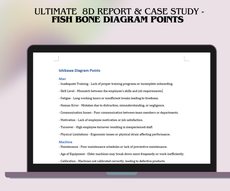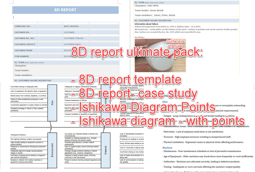 Unlock effective problem solving with our Ultimate 8D Report Template & Guide. This comprehensive resource features a detailed Ishikawa Fishbone Diagram, making quality management effortless for automotive claims.